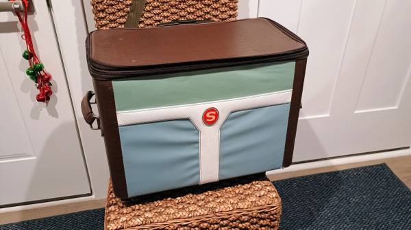It measures approx., 16 inches tall X 22 inches wide X 12 deep. Holds a standard sized sewing machine.