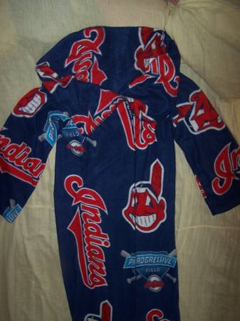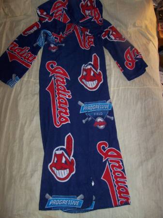 The robe or house coat was worn once and washed. It is like a fleece-type material (soft and warm). It is a one-size fits all and I would guess it is a M - XL. The jacket does not have the tag for size (removed because it is reversible and the owner did not want it to show) so the approximate measurements are: 23" from shoulder to the bottom of the jacket, 11" from under the arm pits to bottom of the jacket and across the chest 21" (sleeves 19 1/2" from shoulder seam to cuff). I estimate it to be a S-M. Serious buyers should inquire about a price.