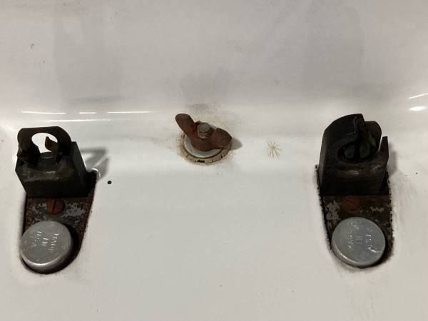 Mitchell Fluorescent Model 2034 Heavy Light Fixtures. Bottom section is porcelain in fairly good shape. Top section was painted black - lots of surface rust. Light worked when I took it down about 8 years ago. Cord is cracked and needs replaced - some of the light posts also have the insulation broken - please see pictures.