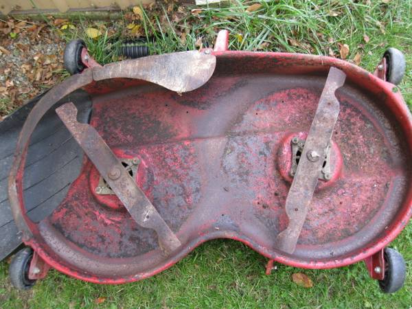 Sears Craftsman twin blade, 46-inch mower deck. Was used on a Craftsman riding mower, model 917.250831 T2400, model year starting 2012. This deck uses cable operated blade engagement and is equipped with 4 anti-scalp wheels. This style deck was also used on Husqvarna riding mowers. No holes, just surface rust. $175
